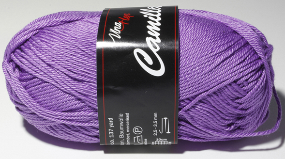 Pletací příze Camilla 50 g. Barva fialová. 100 % bavlna. Návin 125 m. Značka Vlna-Hep. Vhodné na pletení a háčkování. Velikost jehlic a háčků 2,5 - 3,5.