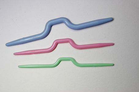Pomocné plastové jehlice průměru 3, 4, a 5 mm délky 9,3 - 10 - 10,8 cm pro pletení copánkového vzoru. Cena za jedno balení obsahující 3 ks.