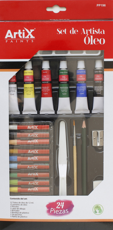 Sada olejových barev pro začátečníky ARTIX PAINTS obsahující 6 ks školních tub po 12 ml (Titanium White, Lemon Yellow, Scarlet, Grass Green, Ultramarine Blue, Carbon Black), 12 ks olejových pastelů, štětec, tužku, gumu, ořezávátko, plastovou špachtli a paletu. Obsahuje malé části. Nevhodné pro děti do 3 let. Není hračka. Určeno jako školní pomůcka.