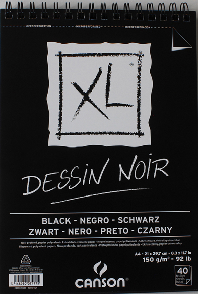 Skicák XL DESSIN NOIR A4 (21 x 29,7 cm) 150 g/ m2, 40 listů černého papíru v kružkové vazbě s mikroperforací. Extra černý univerzální papír. Na jedné straně s hladkou povrchovou úpravou (např. pro fixy a popisovače) na druhé lehce zrnitou vhodnou na tužky a pastel . Značka Canson. TENTO PRODUKT NENÍ HRAČKA.