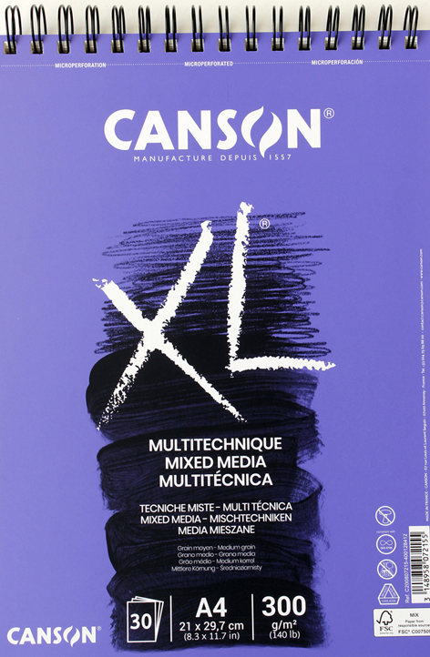 Skicák formátu A4 (21 x 29,7 cm) s kroužkovou vazbou a mikroperforací. 30 listů bílé barvy středně zrnitý. Gramáž 300 g/m2. Vhodný pro kresbu, pastel, uhel, akvarel, kvaš, temperu, akryl a olej. Značka CANSON. Tento produkt není hračka.