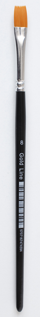 Štětec plochý syntetický GOLD LINE velikosti 8 s dřevěnou lakovanou rukojetí celkové délky 19,5 cm. Vhodný pro olej, akvarel, temperu a hobby barvy. Nevhodné pro děti do 3 let.