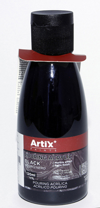 Tekutá akrylová barva POURING ACRYLIC značky ARTIX PAINTS. Černá 120 ml. Barva je ředěná k okamžitému použití. Vhodná pro techniku akrylového lití ( tzv. pouring) či mramorování (marbling) se saténovým povrchem. Před použitím protřepat. Obsahuje malé části. Nevhodné pro děti do 3 let.