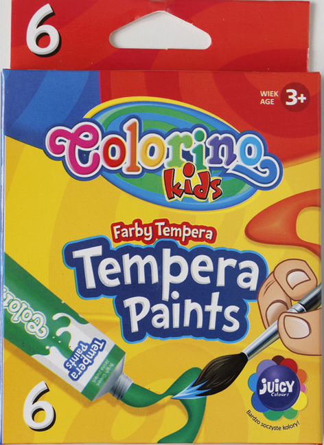 6 kusů temperových barev 12 mm. Obsahuje červenou, žlutou, zelenou, modrou, černou a bílou. Ředitelné vodou. Lze použít pro děti do školy nebo pro malé výtvarníky na doma. Není určeno dětem do 3 let.