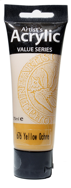 Akrylová barva PHOENIX, okr žlutý, 75 ml. Po zaschnutí lehce matný nádech.