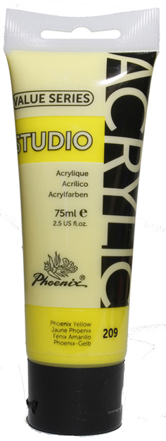 Akrylová barva PHOENIX, primární žlutá (209), 75 ml. Po zaschnutí lehce matný nádech.