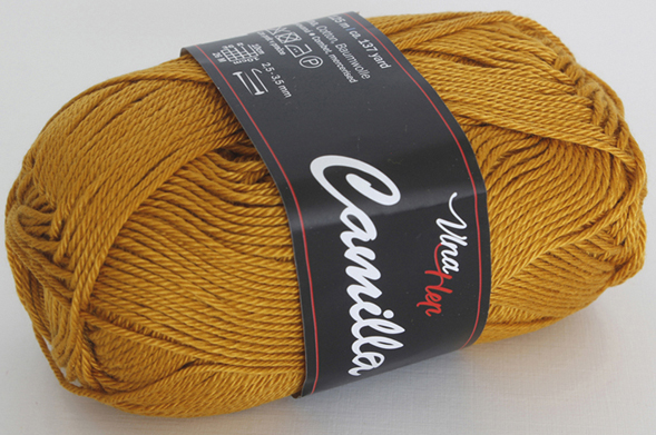 Pletací příze Camilla 50 g. Barva hořčicová. 100 % bavlna. Návin 125 m. Značka Vlna-Hep. Vhodné na pletení a háčkování. Velikost jehlic a háčků 2,5 - 3,5.