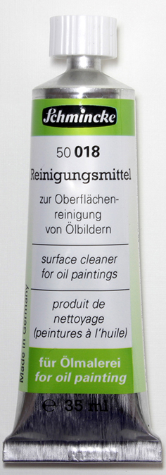 Čistič olejomaleb Schmincke 35 ml v tubě na odstranění povrchových nečistot. Používat jen na důkladně proschlou olejomalbu. Lze ředit vodou. Nanášíme houbičku nebo vhodnou látkou a necháme působit několik minut. Poté opatrně setřeme nános se zachycenou nečistotou. Nutno provést předběžné testy. Pouze pro odborníky! Opakovaná expozice může způsobit vysušení nebo popraskání kůže.