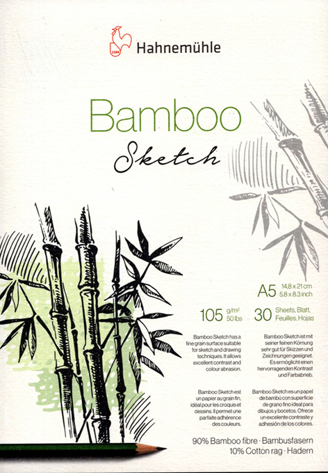 Bamboo skicák (90% bambusové vlákno, 10 % bavlna). A5 (14,8 x 21 cm), 30 listů lehce krémové barvy, 105 g/m2. Vhodný pro kresbu tužkou, uhlem nebo pastelkou.